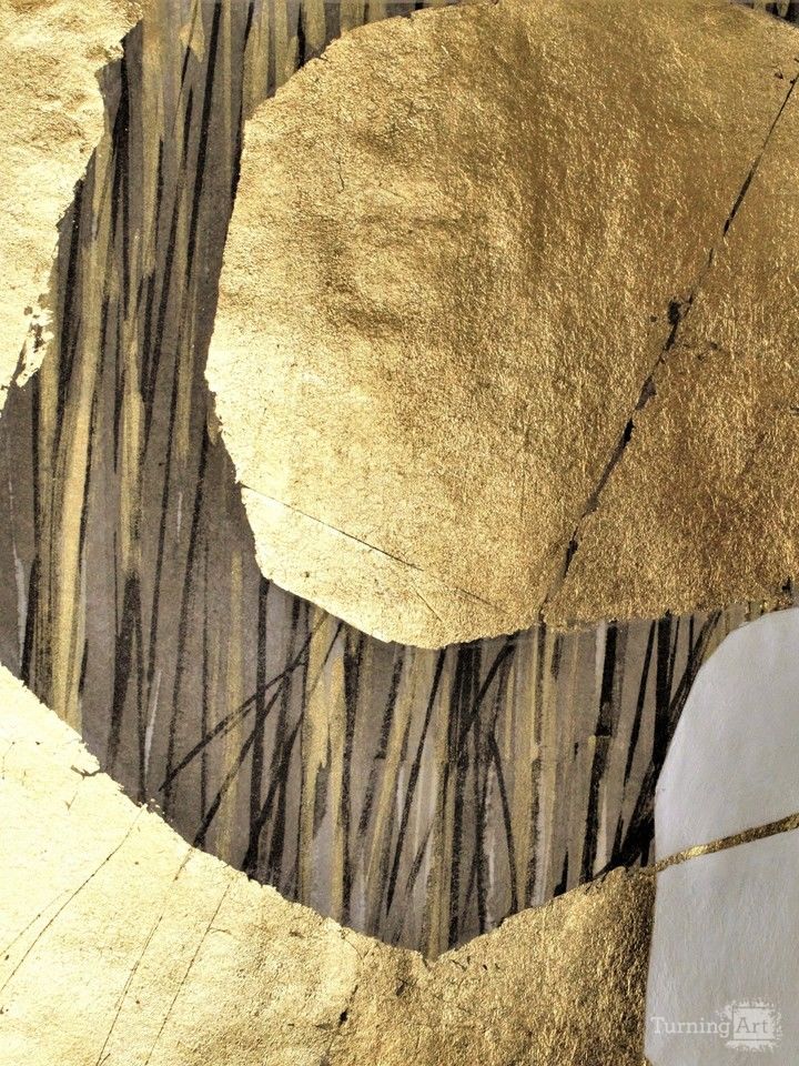 This work explores a time and a place in nature's balancing act. Painting in sumi-ink on mulberry paper was cut out and recomposed with addition of gold-leaf.