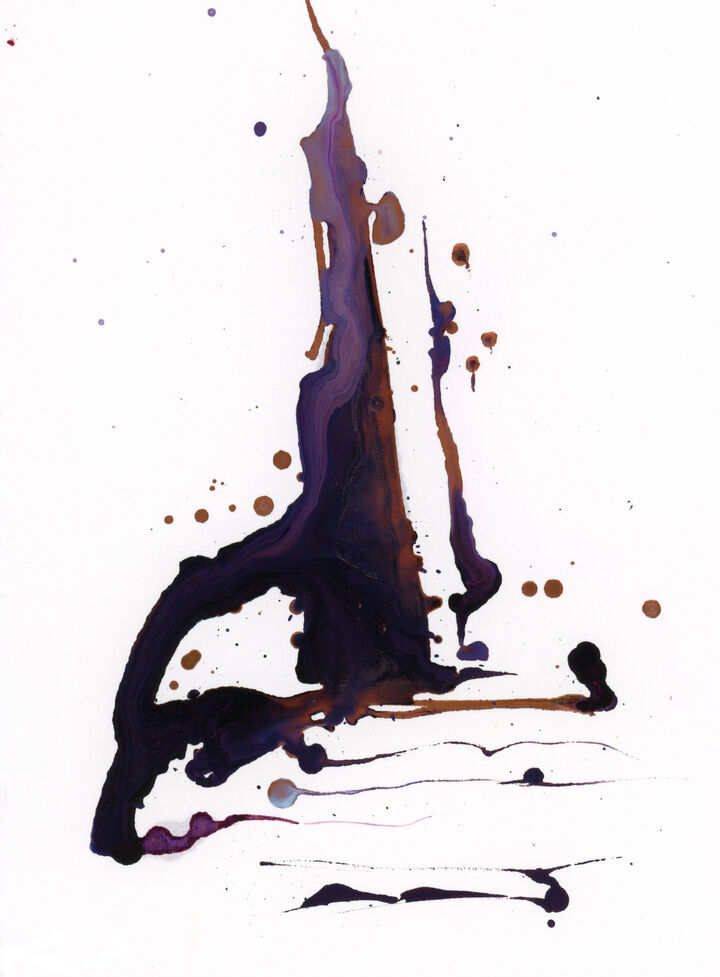 Abstract ink splashes create a striking visual with dark purples and browns forming a central figure against a white background. Varied lines, dots, and drops contribute to the sense of movement and depth. For this series I applied alcohol ink to oil painting paper, which allows the inks to stand on top without diffusing, as it does on other surfaces. I hope you like it and thanks for looking!