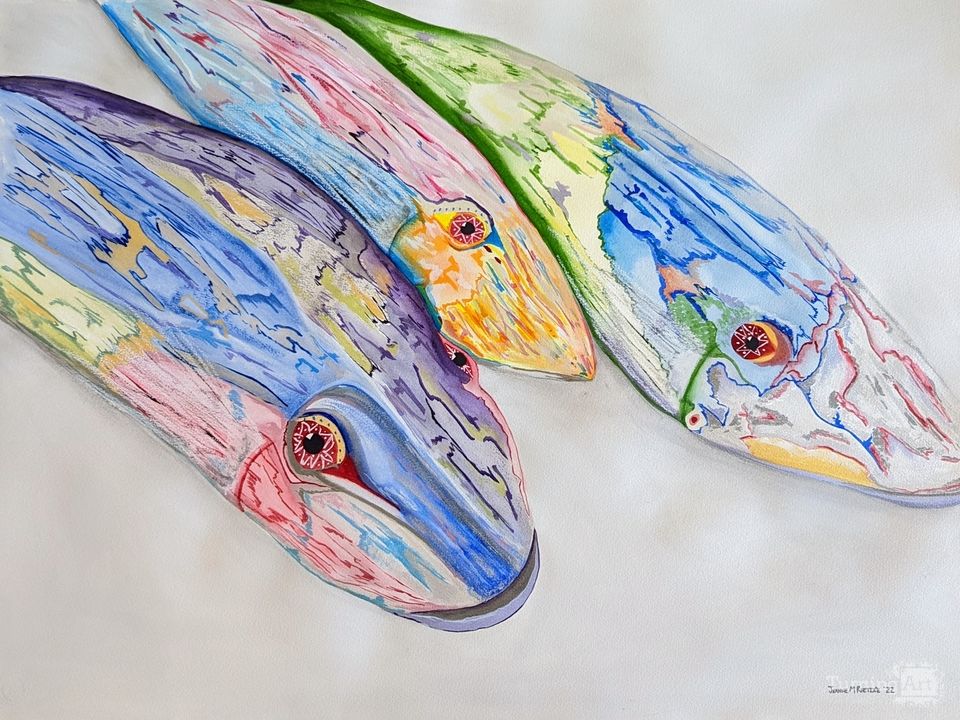 Using photographs of fish in the fish market, Jeanne creates colorful new creatures based on reflections and light. Inspired by the patterns in the reflections, all of the "Fish Heads" are completely different.
