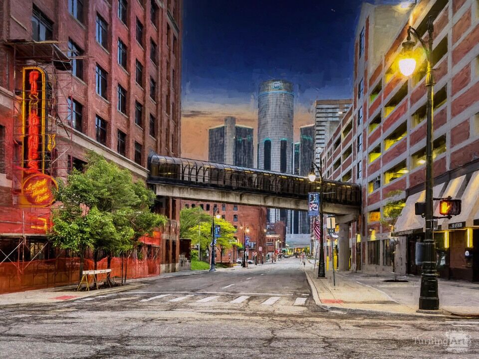 This captivating piece beautifully illustrates the layers of Detroit's urban landscape. From the eye-catching signage of the famous Fishbones restaurant to the intricate elevated walkway of the People Mover, the view draws your eye towards the city's modern heart, the Renaissance Center. A dynamic and textural composition that brings the essence of Detroit's architectural and street life into your space.