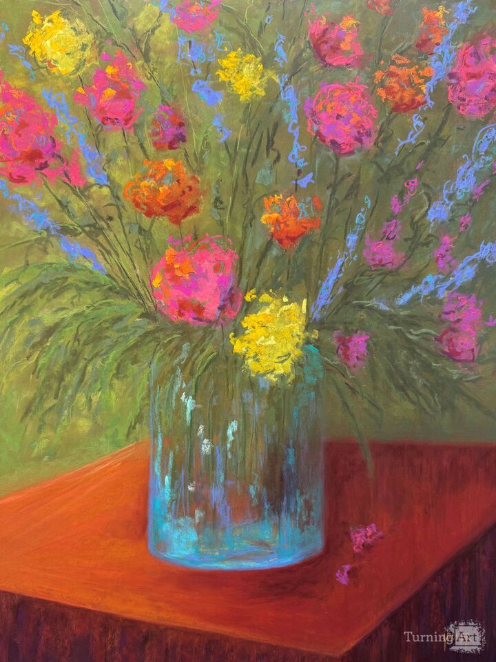 Dina's process looks like this: It always starts with music, which serves to influence what happens on her canvas. At her easel, there is a lot of singing (slightly off key) and there are spontaneous dance parties. Her canvas is a gritty piece of paper, sometimes purchased, sometimes hand-made. With the music on, she uses a photo reference she has taken for inspiration and sketches her composition on her canvas. Sometimes, there isn't a photo reference at all but rather an idea in her head that she works from. She doesn't typically pre-select the colors or values of pastels that she uses, preferring to choose pastels that speak to her in the moment. She often starts with an underpainting, which is the first layer of a painting, using rubbing alcohol to set it permanently on her canvas. She has found that vodka, gin or tequila will work in a pinch when rubbing alcohol isn't available. Sometimes there are happy accidents at the easel and sometimes tragic outcomes but regardless, being at her easel is her favorite place to be.