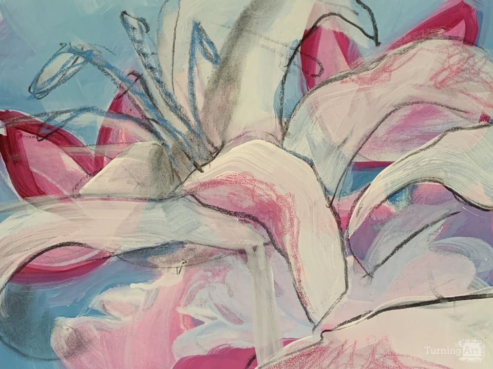 Lyrical and expressive lines describe this floral abstraction. Using teal, fuchsia and white, the color palette speaks to spring, life and joy.