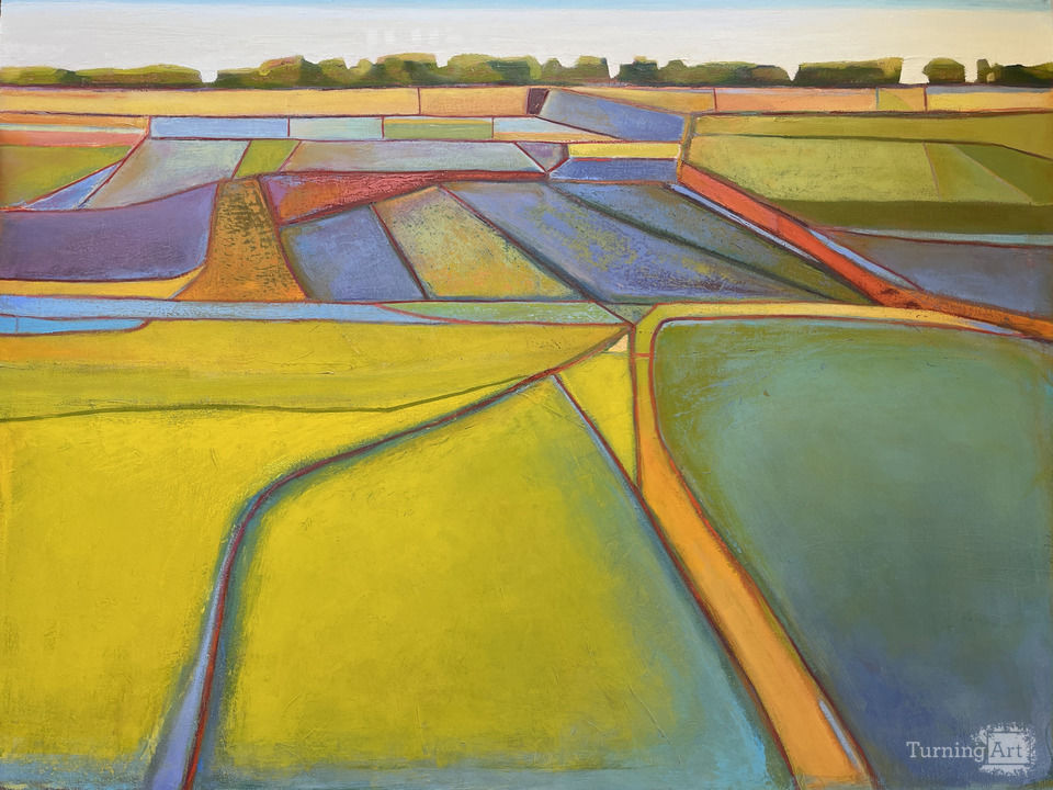 This is an imagined abstract landscape with a play on perspective. I like to mix one point perspective with a naive representation of space to mix planes. This painting has many layers of oil paint and paint mixed with waxes, as well as oil crayon highlights.