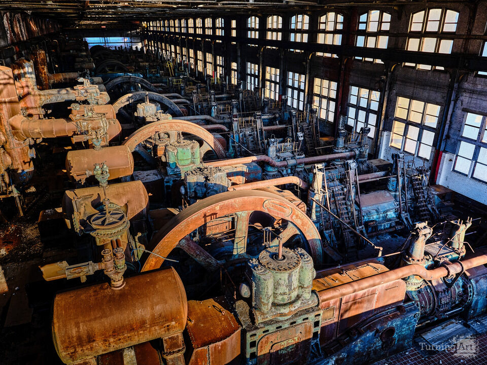 Rows of rusting Flywheels and other equipment on the factory floor at the Bethlehem Steelworks in Pennsylvania at sunset