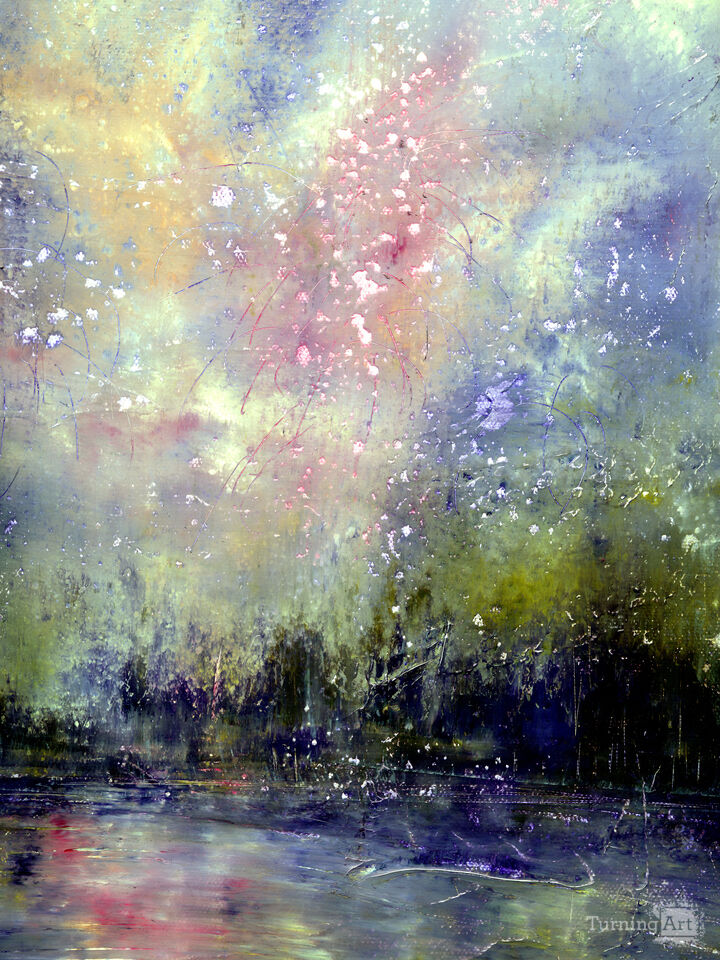 A dreamy, abstract landscape with bright fireworks mirrored on the water. Inspired by watching 4th of July fireworks raining down over the lake in Oklahoma City.
