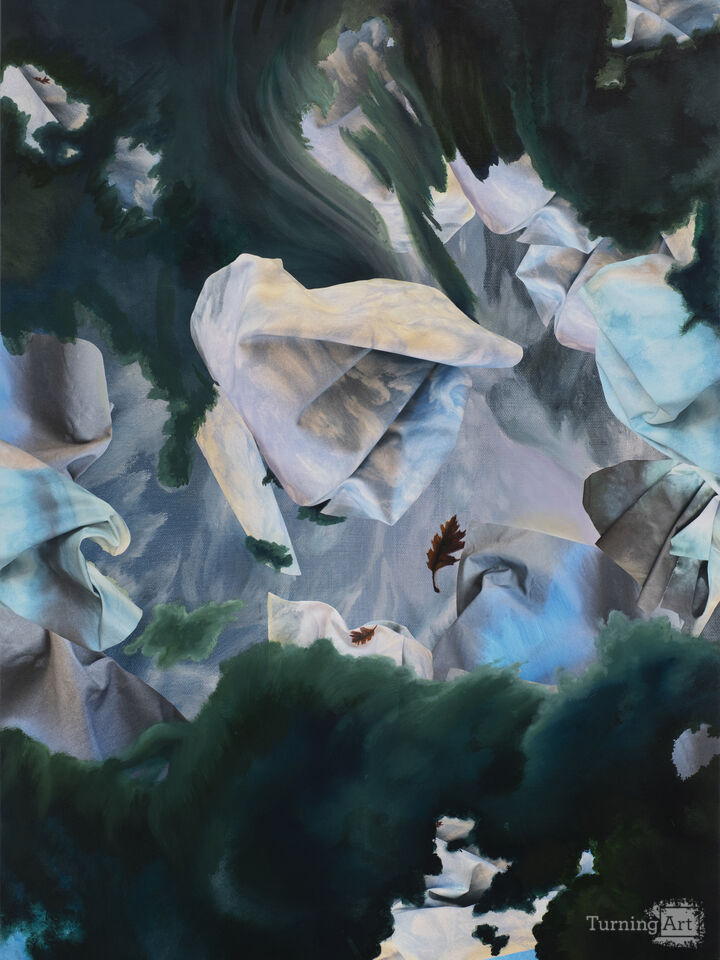 These deep-spaced paintings were inspired by the philosophy that all beings are intrinsically important pieces of a larger whole, like how every jigsaw piece is necessary to create a full image. The deep skies, which represent the world beyond us, are paired with specific focal points which are depicted with more detail and specificity than their environments, suggesting that we relate to them as individuals. The deep and near are depicted together in overlapping layers that suggest that although we are individual actors playing out our lives, we are part of a larger system which we can only partially understand from our limited vantage points. My toenail does not know that it is part of me nor that the “I” it is part of likes sitcoms, existential philosophy, and dry wine. We, being so much more than the sum of our body parts, can realize that our understandings of our experiences are limited, and this series plays with the endless possibilities that offers.