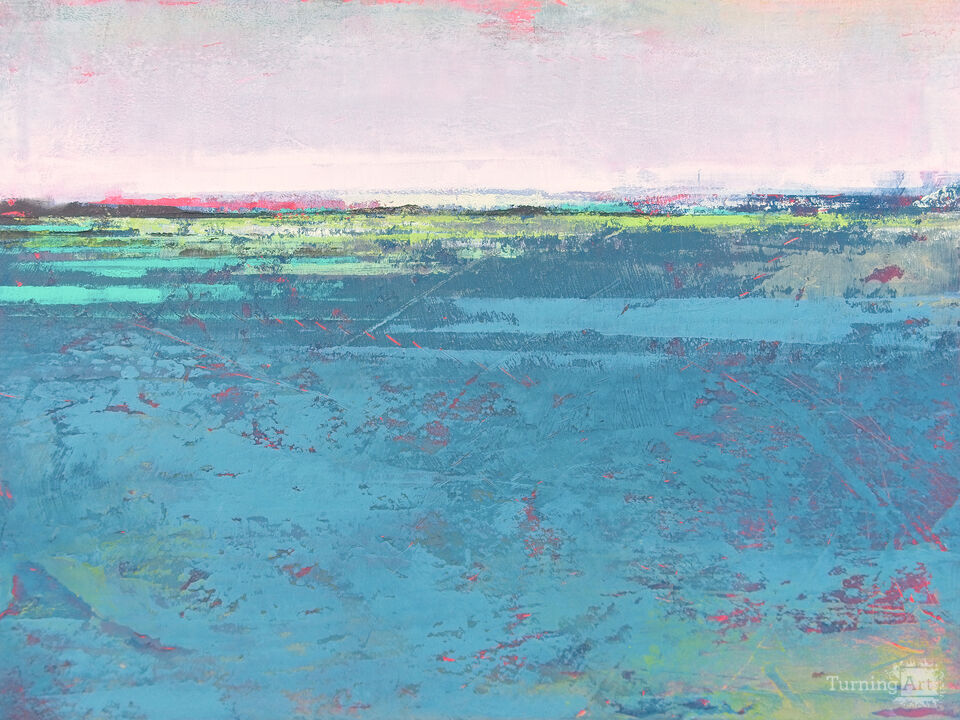 "Frisco Bay" flows in layered bands of blue and teal, accented with hints of red, purple, and a horizon of soft greens and yellows beneath a pale pink sky. Its textured brushwork and tonal balance evoke quiet expanses and natural rhythm. Perfect for creating a calm, contemplative space with both depth and serenity.