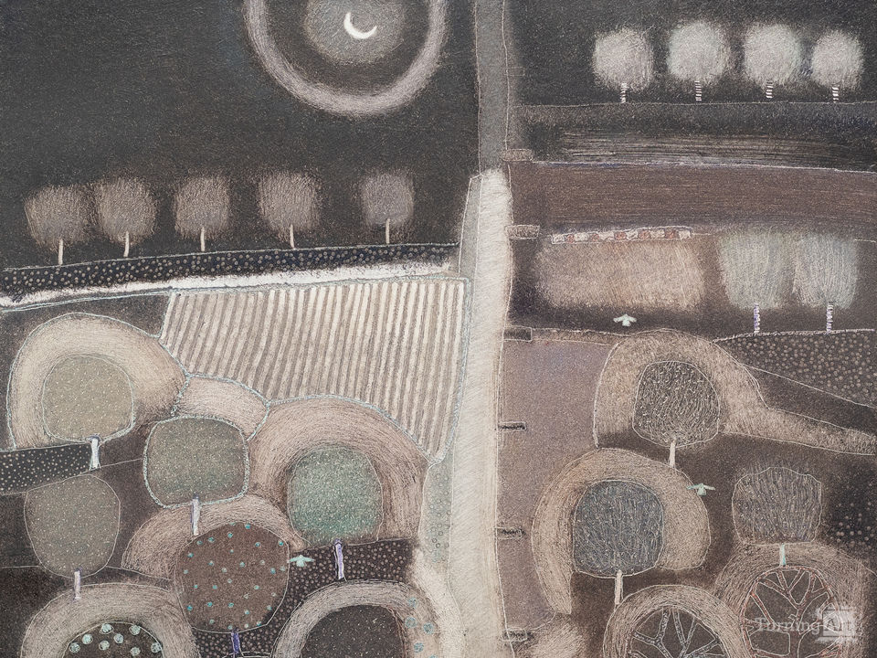 A night landscape in brownish grey, imaging walking out of the forest into the moonlit fields.
