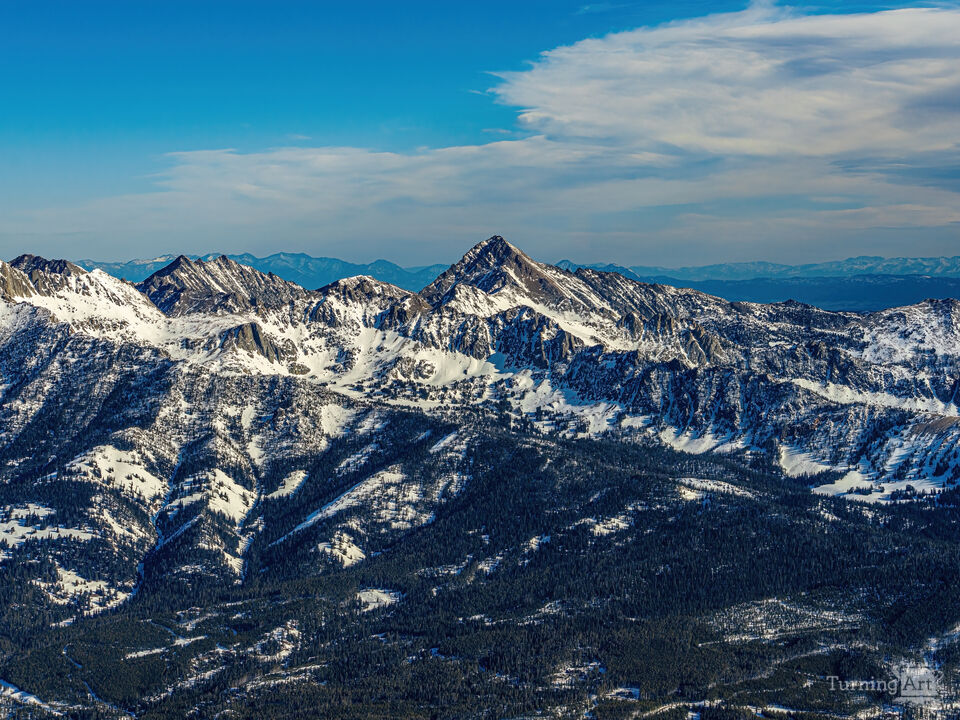From the summit Lone Peak at Big Sky the view of the Spanish Peaks stretches across the horizon. A long, jagged wall of snow and ancient dark rock rising above the wilderness under a deep blue Montana sky. With Gallatin Peak standing prominently in the center, the the ridges and summits go on until they disappear into the far horizon.