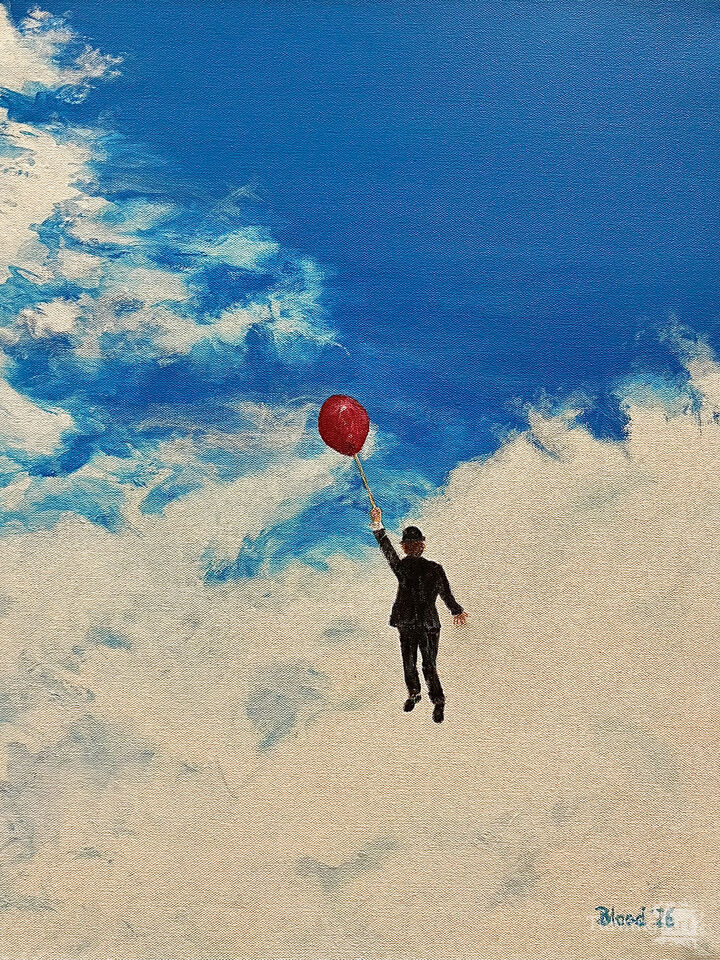 In this minimalist painting, we see a man in a bowler hat who is well up into the sky, being carried away by a red balloon. He is way above the clouds and off to who knows where. This piece captures a moment of surreal elevation that is both calming and thought-provoking. The contrast between the dark-clad man in a bowler hat and the vibrant balloon draws immediate attention, emphasizing the delicate balance between weight and lightness. The overall composition juxtaposes the small, solitary human presence against the boundless sky, evoking themes of escape, freedom, and whimsy. It's extremely simple, yet also quite striking. It's a blend of minimalism and surrealism that explores freedom and escape. The solitary figure lifted by a red balloon symbolizes the delicate balance between dreams and reality. Imagine the uplifting energy it will bring to your space—encouraging you to rise above limits and embrace wonder every day.