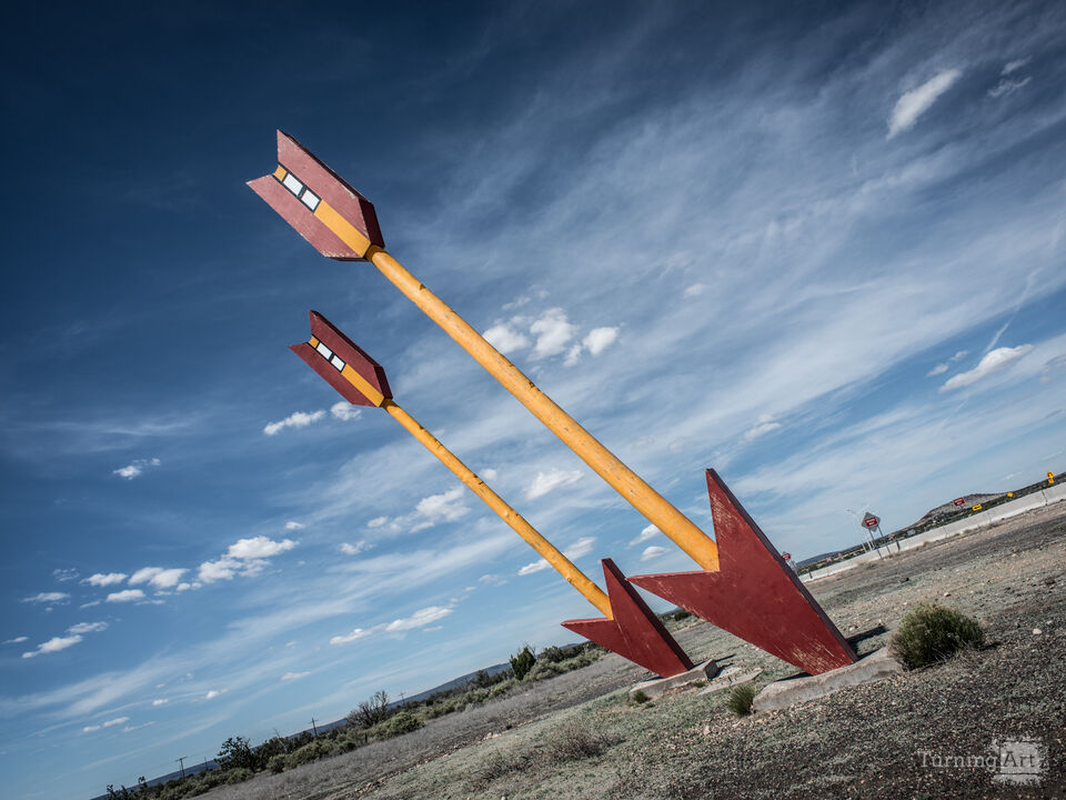 Two enormous painted wooden arrows — yellow shafts with deep red fletching and arrowheads — are planted dramatically in the high desert scrubland along Route 66 near Two Guns, Arizona or the Two Arrows trading post area of New Mexico, their feathers skyward against a sweeping blue sky laced with wispy clouds. The sculpture's bold graphic geometry and warm red-and-yellow color palette stand in striking contrast to the sparse, muted desert landscape surrounding them, creating the kind of larger-than-life roadside spectacle that made Route 66 legendary. The low-angle perspective amplifies the arrows' scale and drama, making them feel monumental against the open Western sky. This image captures the playful, audacious spirit of American roadside art and the romance of the open road in a single unforgettable frame.