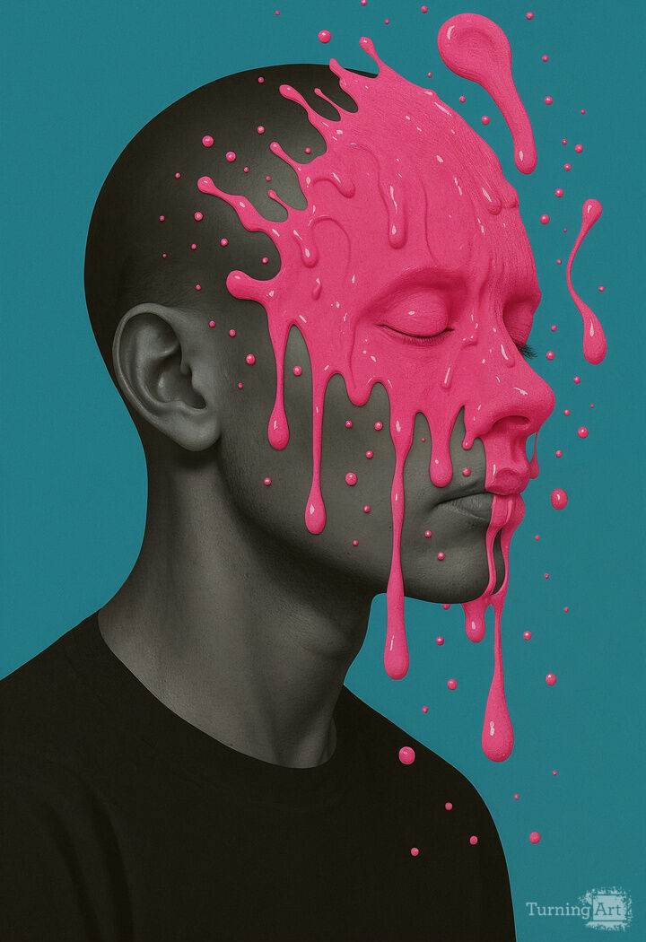 Glossed Over captures the quiet tension of suppressed emotion wrapped in vibrant aesthetic. The fuchsia paint appears both beautiful and intrusive—symbolizing how outward appearances often conceal inner complexity. Set against a clean teal backdrop, this portrait blurs the line between vulnerability and composure, offering a striking visual metaphor for emotional camouflage. A bold and fashion-forward statement piece for contemporary spaces.