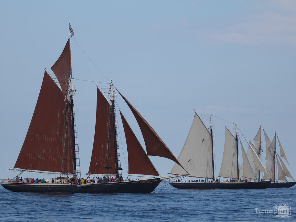 Traditional schooners race across the waters off Gloucester, Massachusetts during the annual Gloucester Schooner Festival. These historic fishing vessels represent the working boats that once dominated New England’s offshore fisheries. Their long hulls and distinctive gaff-rigged sails create a dramatic silhouette against the open sea. During the race, multiple schooners sail together in a tribute to the region’s maritime heritage. The image captures both the elegance and power of these classic sailing vessels. It reflects the enduring legacy of Gloucester’s historic fishing fleet.