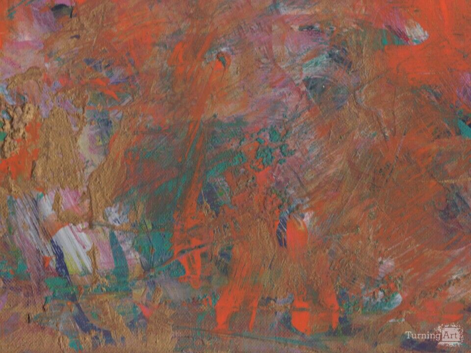 I like the color combo of orange/gold/green, as well as the brushstrokes that are still visible as layers of the painting