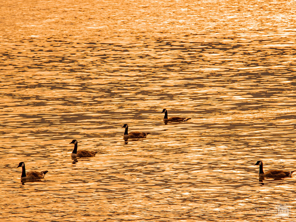 The morning sun casts a golden glow over the Hudson river as the geese begin the day.