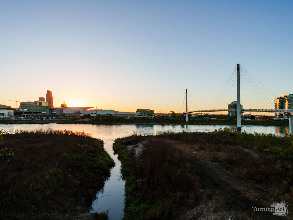 This sunset photograph captures the bold golden light radiating behind the Omaha, Nebraska skyline, casting a brilliant glow that reflects off the skyscrapers and dances across the surface of the Missouri River, the natural boundary between Nebraska and Iowa. A small rivulet from the riverbank leads the eye toward the shimmering water. Taken from Council Bluffs, Iowa, the scene highlights the iconic Bob Kerrey Pedestrian Bridge—a 3,000-foot cable suspension footbridge recognized for its graceful, snake-like curve. Those crossing the bridge by foot, bike, or scooter may even feel its gentle sway, creating a memorable experience suspended above the river.
