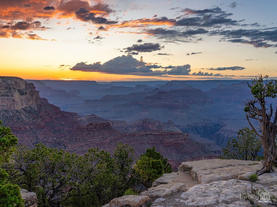 As the sun dips below the horizon, the Grand Canyon transforms into a canvas of fiery orange, soft yellows, and deep blues. Viewed from Yavapai Point on the South Rim, the canyon walls stretch endlessly into the distance, bathed in dramatic light and shadow with a shroud of drifting smoke from the Dragon Bravo wildfire on the North Rim. This breathtaking sunset view captures the immense scale, layered geology, and the timeless beauty of the American Southwest.