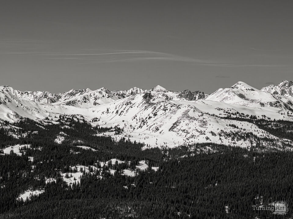 A multi-image expansive panoramic view of the rugged, snow-capped peaks of the Gore Range from the 12,000' summit of Copper Mountain Ski Resort in Summit County, Colorado. The black and white tone highlights the rugged terrain and intricate patterns formed by the trees and snow.