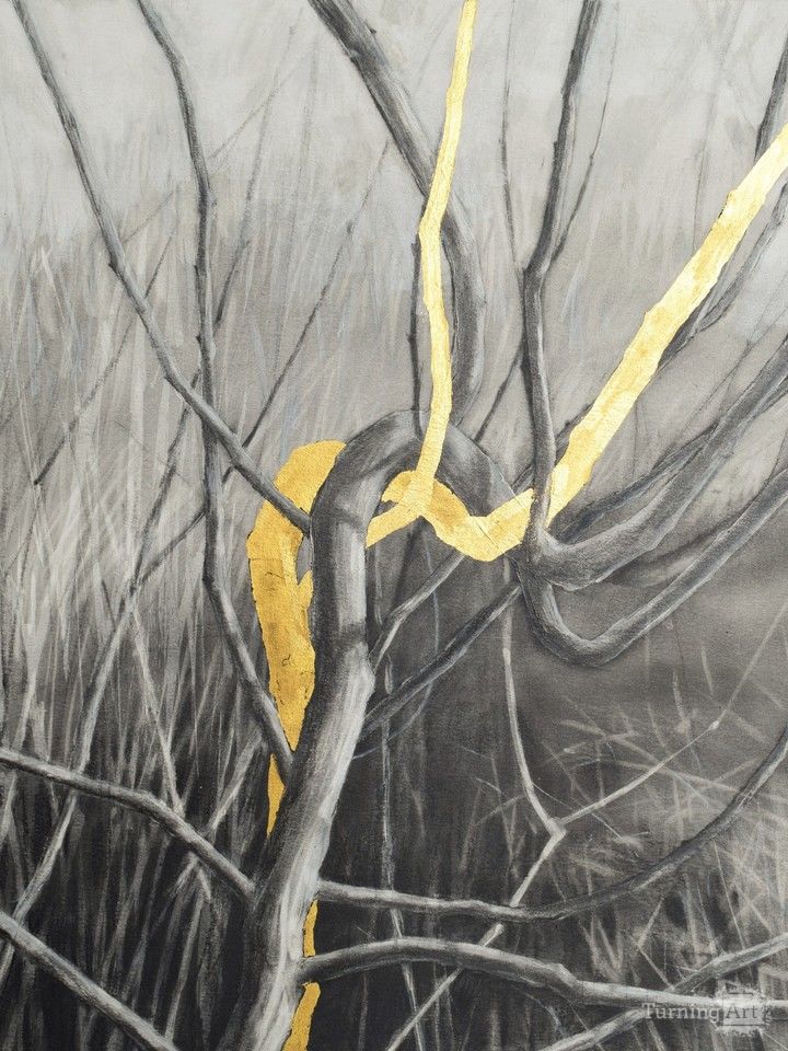 The drawing is in graphite, charcoal and 24k gold leaf on paper.