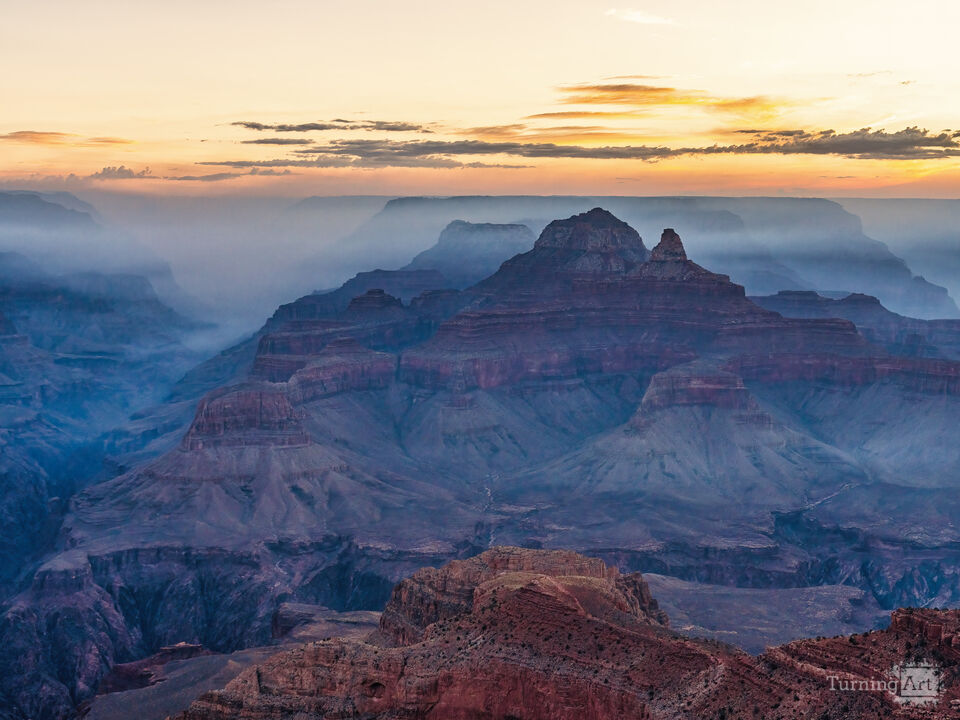 A hauntingly beautiful view looking north from Mather Point over the Grand Canyon cloaked in early morning smoke from the 2025 Dragon Bravo wildfire on the North Rim. Ancient rock layers fade into soft gradients of red, purple, and blue as the smoke drifting through the canyon's vast expanse adds a surreal feeling, blurring the lines between earth and sky. Beneath the warm glow of sunrise, the canyon is captured, not in its usual clarity, but in a moment where light, smoke, and stone converge to tell a deeper story.