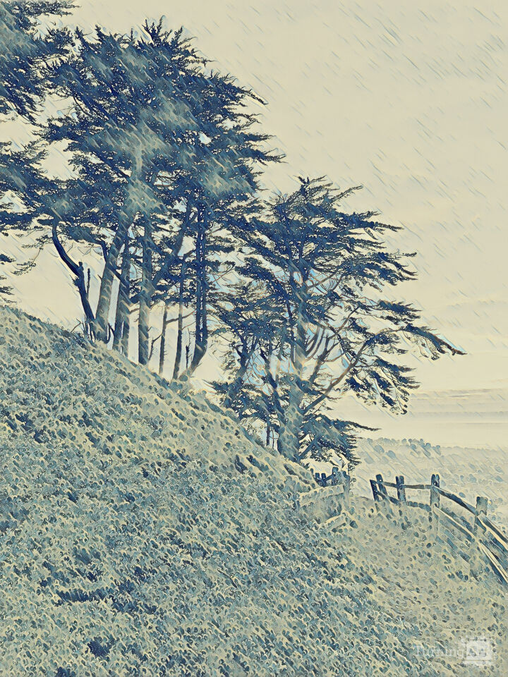 This beautifully textured artwork "Grand View Hill 8477" shows majestic trees and grand views of a dreamy landscape on a rainy day. The landscape is full of details. The color palette is calming, in shades of blue, the brush-stroke is soft. The topic brings the viewer into relaxing, rejuvenating outdoors. These artworks print up to 70 inches tall, and larger upon special request. Find more art in this style to create art-groupings in your space.