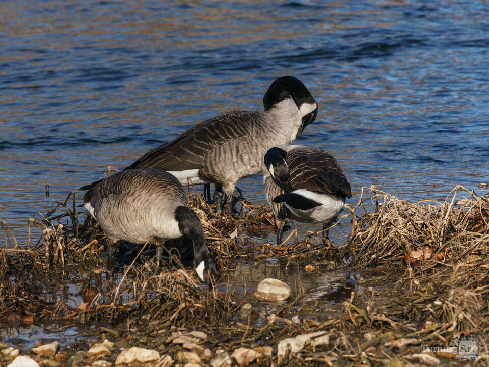 Three Canada Geese stand on a grassy patch in the middle of Shoal Creek in Joplin, Missouri, United States during the winter season. A couple of them are grooming their feathers while another hunts for food. I love the goose that is cleaning his tail feathers. So cute.