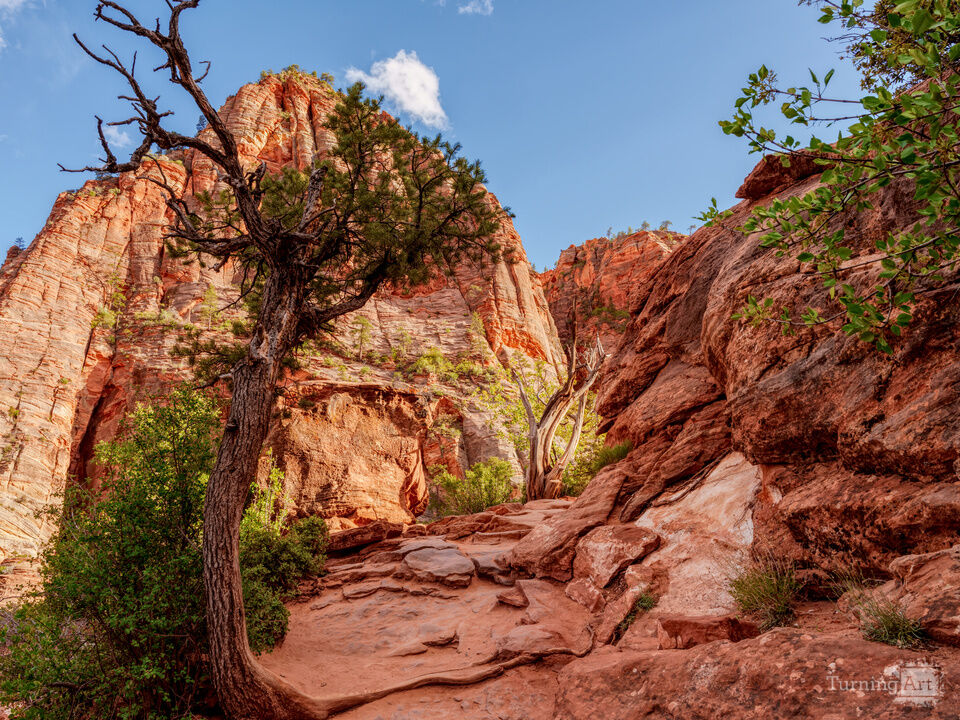 A striking cedar tree arches over the rocky terrain along the Zion Canyon Overlook Trail in Zion National Park, Utah. Shaped by years of wind and sun, it has the refined look of a natural bonsai perched near the edge of a red rock cliff. Beyond it, sheer sandstone cliff walls catch the warm evening light while a few clouds move overhead and patches of green vegetation spot the canyon. A narrow trail winds along the mountainside, guiding hikers through a short but highly scenic route with wide, memorable views of the desert landscape.