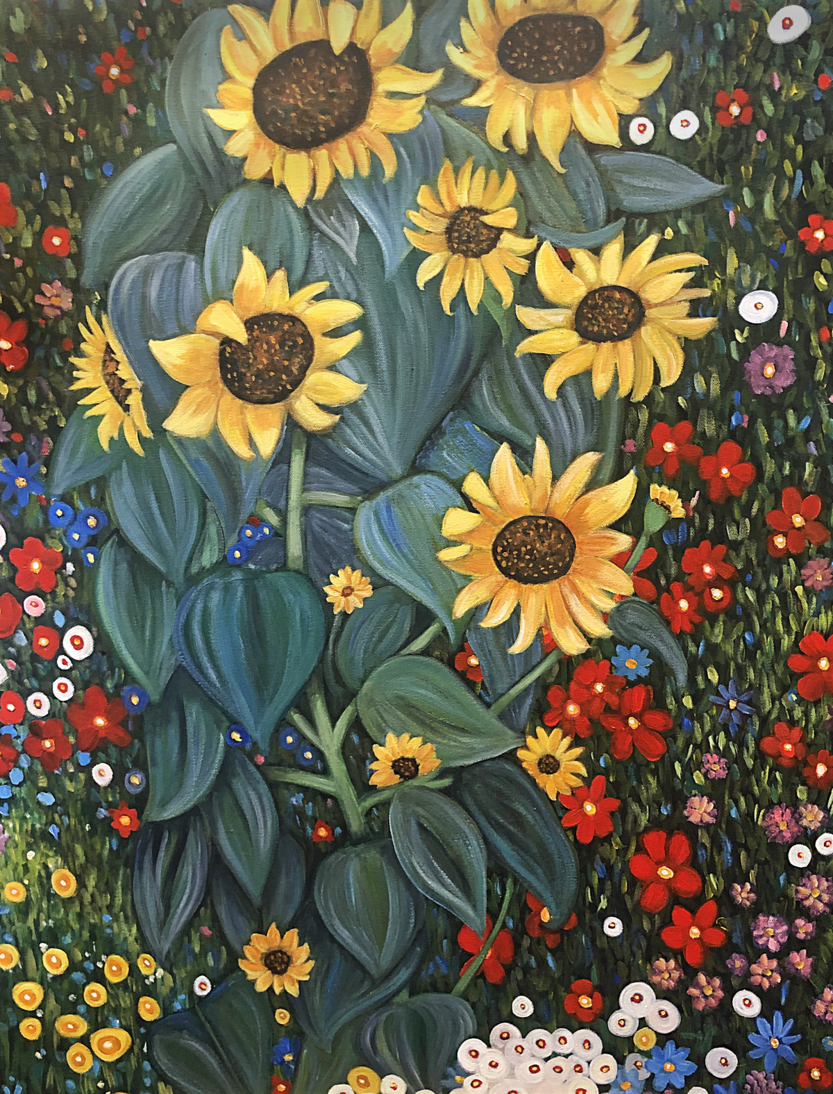 This piece is my ode to Gustav Klimt's " Farm Garden with Sunflowers". I wanted to paint an homage to him, as I think his floral work isn't as celebrated as his portrait work and it should be. My favorite flowers for my favorite artist.