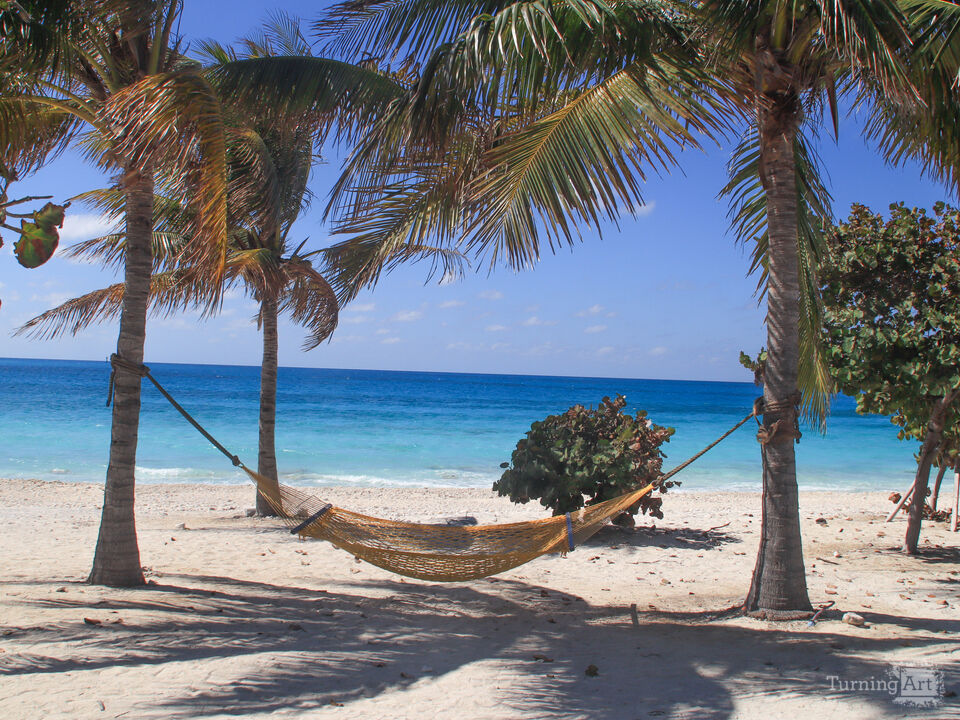 A hammock hangs gently between two palm trees on a bright white sand beach in the Bahamas. The shade of the palms offers a peaceful place to rest while turquoise Caribbean water stretches toward the horizon. Soft ocean breezes move the palm fronds while the hammock waits in the quiet shade. The scene captures the relaxed atmosphere of island life and the simple pleasure of slowing down beside the sea. Clear tropical light and vivid colors emphasize the beauty of the coastal landscape. The photograph reflects the calm and inviting character of a Caribbean beach.