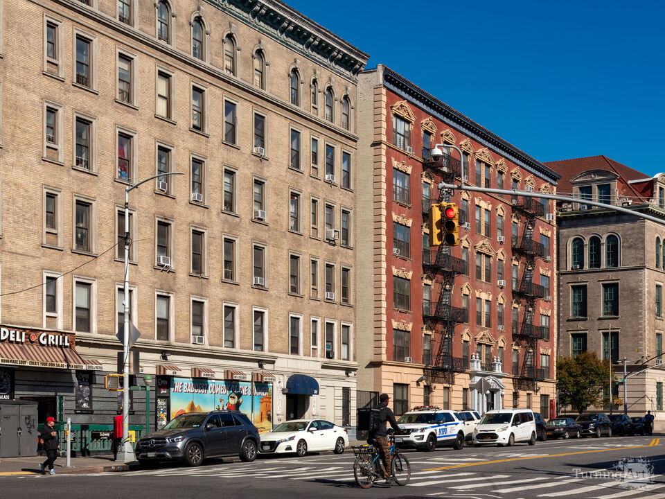 A street corner in the Harlem neighborhood featuring historic brick residential buildings and a local deli.