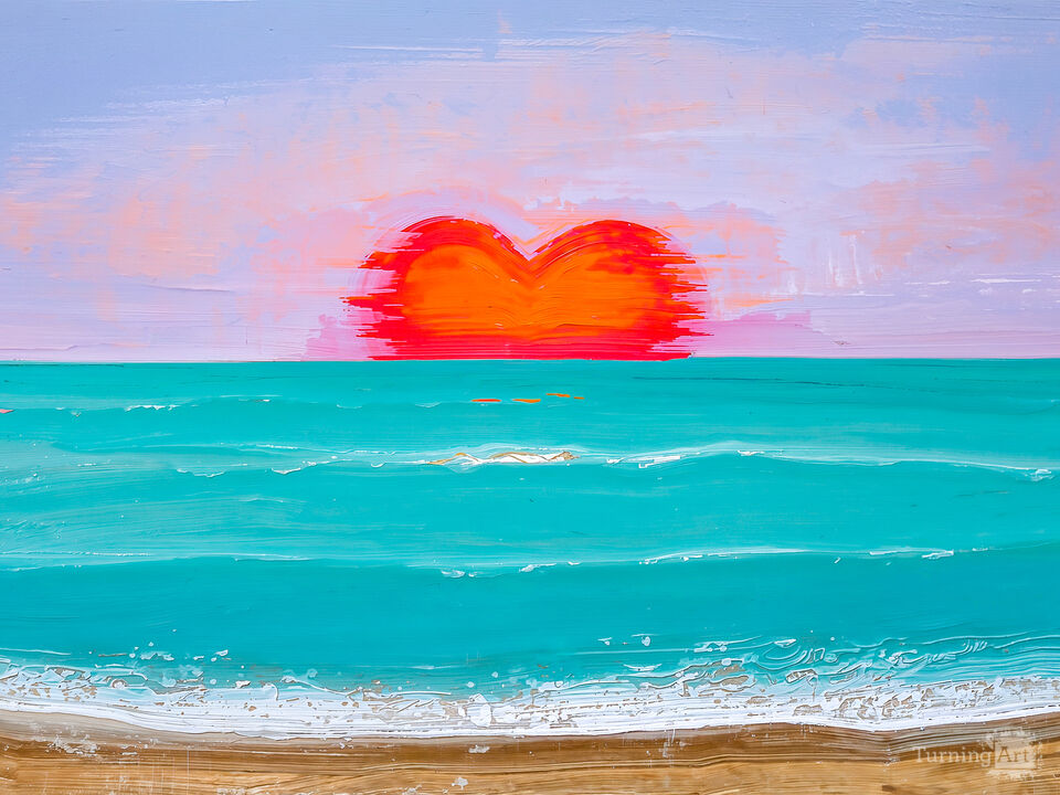 A vibrant heart-shaped sun sets over the ocean, casting a warm glow on the water. The sky is a mix of soft pinks and purples, contrasting with the teal waves. Created with AI plus additional editing in a modern painting style.