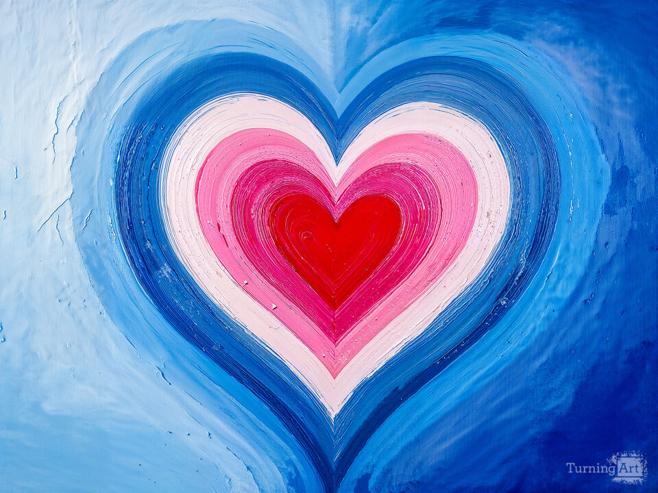 A vibrant heart is layered with varying shades of red and pink against a swirling blue backdrop. The colors create a dynamic and expressive visual appeal.