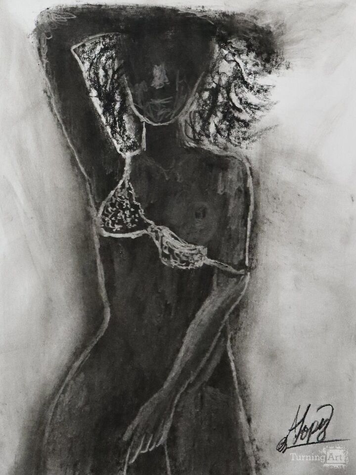 This striking monochromatic artwork by Alicia Lopez captures a female figure in a dynamic pose. Rendered with expressive charcoal strokes, the figure's form emerges from deep shadows, contrasting with the lighter background. One arm gracefully extends above the head, while the other crosses the lower torso, creating a sense of fluid movement. The intricate pattern of the lace bra is meticulously detailed, providing a delicate counterpoint to the bold, smudged textures of the body and the swirling lines of the hair. The artist masterfully uses varying shades of black and grey to define contours and volume, imbuing the piece with a raw, intimate energy. The visible signature "Lopez" anchors the authenticity of this powerful work.