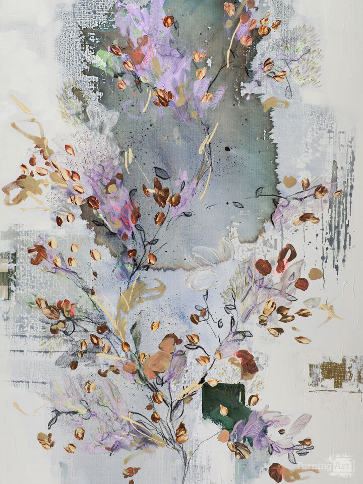Delicate botanical traces gather like pressed memories, layered and preserved by time. The painting becomes a personal archive—where emotion, season, and remembrance are held in quiet bloom.