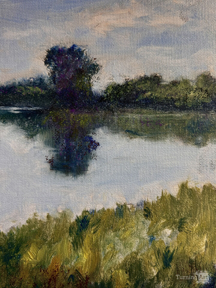This piece captures a quiet moment at a neighborhood lake just as the autumn air begins to settle. I was drawn to the stillness of the water, which acted like a window reflecting the deep, cool tones of the shoreline trees against a soft sky. My goal was to translate that feeling of finding a sanctuary in the familiar, everyday spaces close to home. I hope this view offers a restorative pause and a sense of gentle belonging to anyone who stands before it.
