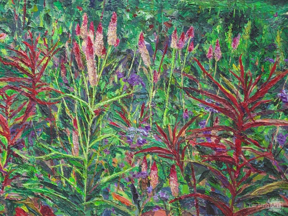 Vibrant hues of red and green intertwine, creating a lush depiction of plants with spiky leaves and delicate blossoms. The scene is rich with detail, showcasing a lively, natural setting filled with diverse vegetation.