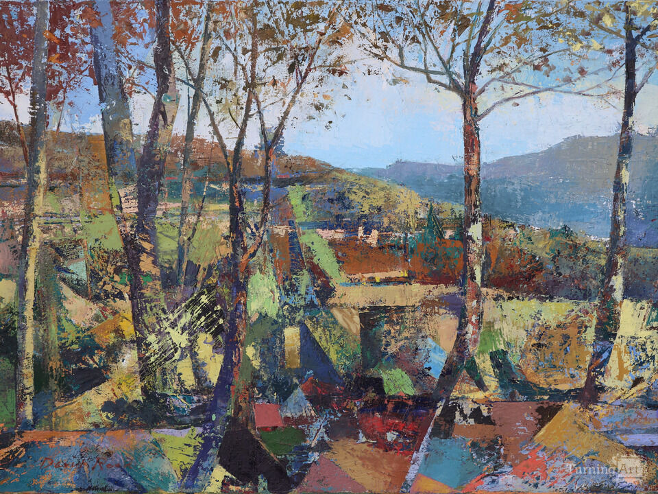 A painting that is a compilation of different landscapes near my boyhood home but with some exaggerations of scale and painterly markmaking especially in terms of texture and color.