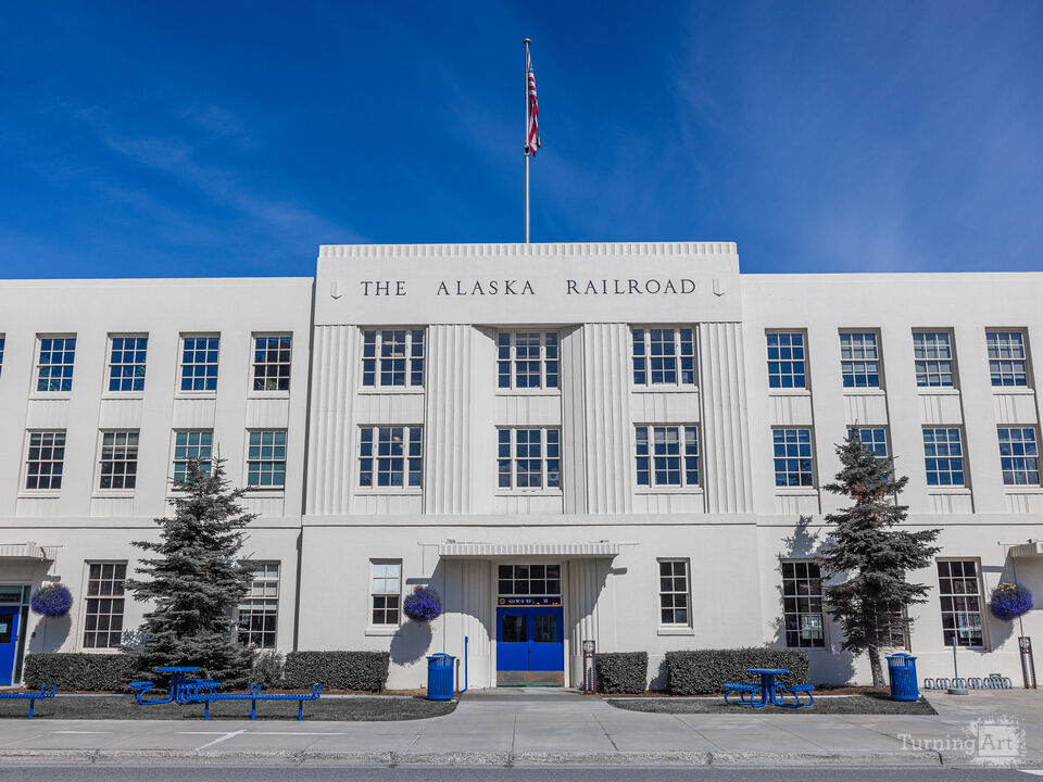 A stately white building houses the Alaska Railroad Depot. The facade is symmetrical, featuring numerous windows and an American flag atop, flanked by decorative evergreens. Clear blue skies enhance the grandeur and historical significance of the structure.