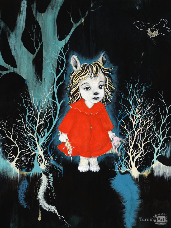"Holding on" was included in my show Tales From The Root Cellar. The collection was inspired by my recollection of my childhood memories, nostalgic collectables, and life experiences. I build stories by carefully choosing familiar elements and reinventing them into magic or mystique. This collection unfolds intensely personal and evocative stories that engage the viewer into their world of rich and quirky imagery. Holding on is a portrait of my first dog Ella. She helped me get through some challenging times.