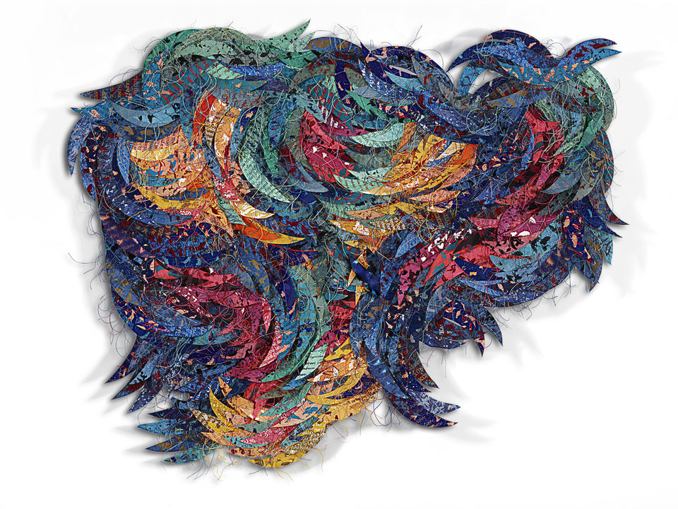 Homeland is the last piece in the Cambodia series which is based on map of Cambodia, the last remaining habitat of the nearly extinct Bengal Florican. The title refers to birds that are victims of habitat fragmentation and who have shrinking access to their old homelands. I make the feathers from plastic recycled bags screen printed with images of endangered birds and overprinted with text in endangered languages such as Yiddish, Shorthand, numerous indigenous languages and excerpts of Rachel Carson's Silent Spring translated into Spanish.