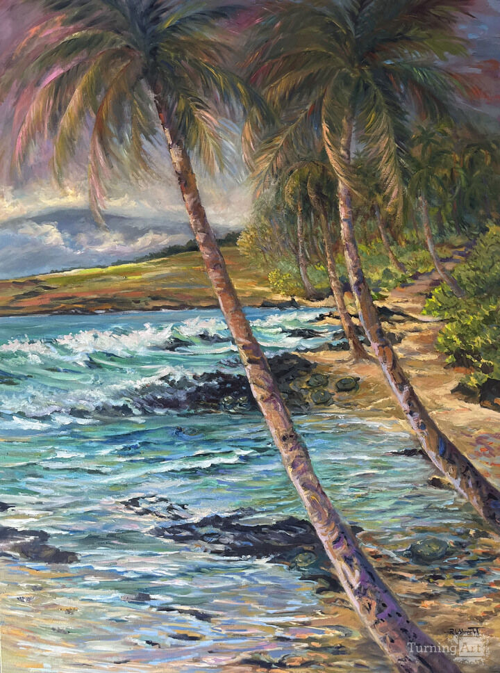 Honu rest Maui glows through to Puako. Oil painting using the glowing light of Hawaii to remember the love of Maui on the horizon and the amazing Honu on the shore of Pauako. The trail from the shoreline access is magical and changes daily when you walk the amazing trail. This 3' x 4' vertical painting is a celebration of light as it sets over Maui to the Kohala shore. The idea was developed with acrylic paint tonally and moved into color and the soft brush marks of oil paint. The images were created by the brush