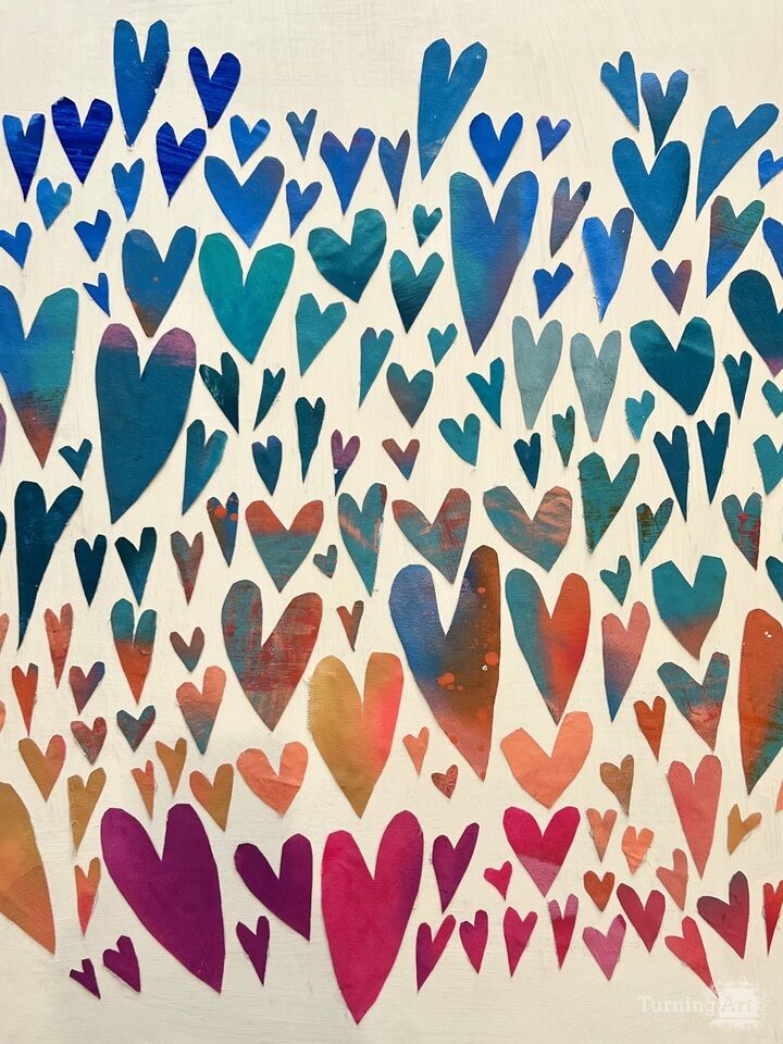 This is the culmination of the Hope Floats Collection – the dream that finally materialized. Every heart was hand-cut from painted canvas remnants and attached to this stunning cradled pine panel. I hope you feel the affection flowing from me, to the artwork, to you, to the world.