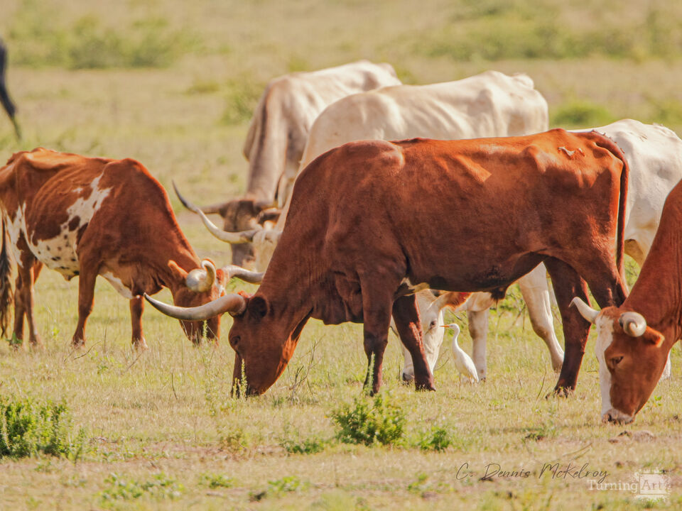 Longhorns grazing together in a pasture on the coastal plains of southeast Texas. The Longhorn cattle were a very important breed of livestock i early Texas. They are very stout, mild mannered. Large herds were herded on the famous cattle trail drives from Texas to other states. Many were shipped up north to supply meat for the large cities.