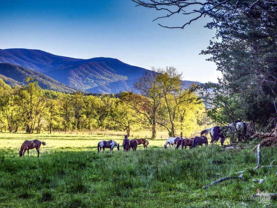 A quiet herd of horses grazes peacefully in a wide, sunlit meadow beneath the rolling blue ridgelines of the Smoky Mountains. Fresh spring foliage glows in soft golden light as layered hills fade into the distance, creating depth and atmosphere throughout the scene. The gentle contrast between open pasture, rising forest, and distant mountains evokes a timeless sense of calm, freedom, and connection to the land. This image captures the enduring rhythm of rural life set within one of America’s most iconic mountain landscapes.