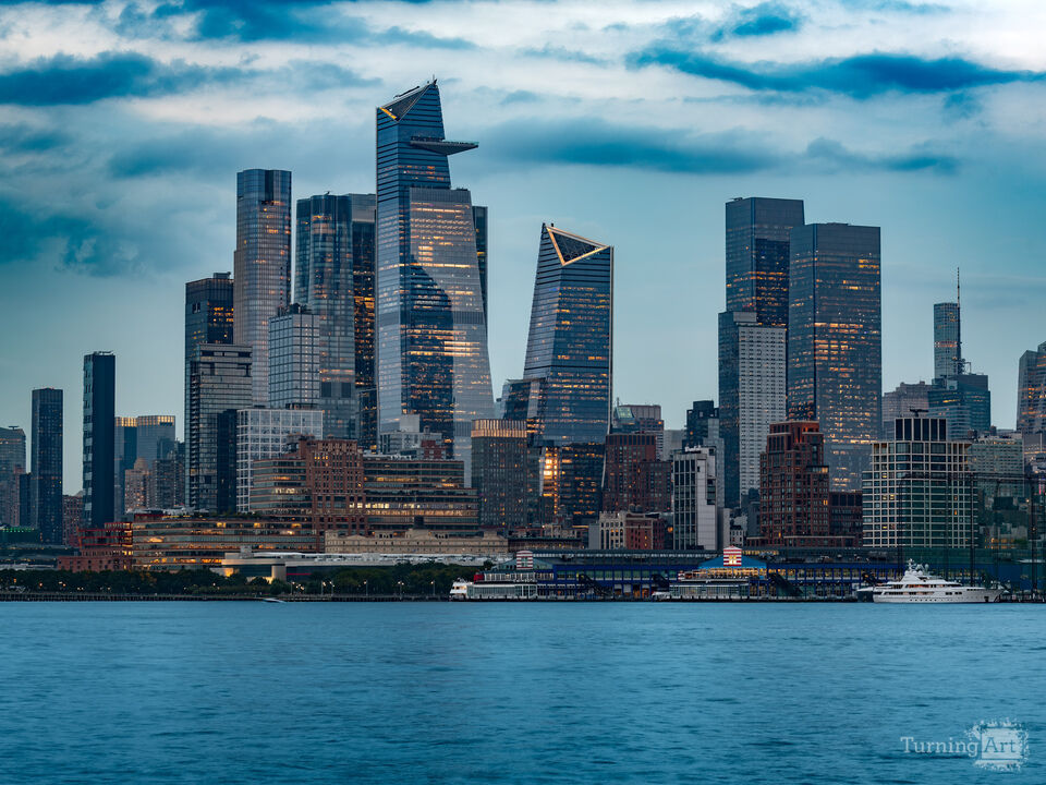 The modern and distinct architecture of the Hudson Yards skyscrapers illuminated at dusk in New York City.