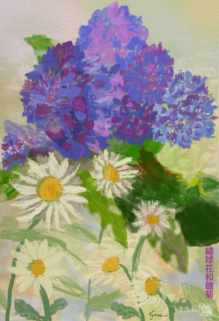 The artist demonstrates a nuanced understanding of both color harmony and composition. The decision to spotlight hydrangeas in rich tones of blue and purple instantly draws the viewer’s eye upward, establishing a dynamic focal point with a sense of both lushness and serenity. Balancing these saturated hues with the lighter, sunlit daisies introduces charming contrast, allowing moments of brightness to punctuate the scene. The placement of the daisies, scattered throughout, serves to guide the gaze through the arrangement, creating visual rhythm and a sense of gentle movement.