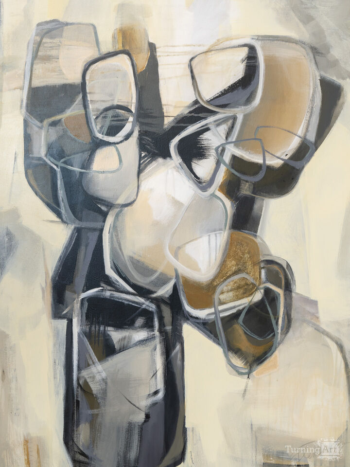 I Am Giant offers a quietly compelling dance of shapes and shades, where fluid, organic forms weave together with a natural ease. The composition’s muted palette—soft blacks, whites, grays, beiges, and subtle ochre accents—grounds the piece in a calm, inviting atmosphere, while bold dark outlines give the shapes definition and a sense of layered depth. This interplay between smooth, blended brushwork and textured, more deliberate strokes creates a lively rhythm that draws the eye through the composition, suggesting movement without overwhelming the senses. The artwork strikes a thoughtful balance between complexity and simplicity, inviting viewers to explore its nuances at their own pace within an understated, harmonious space.