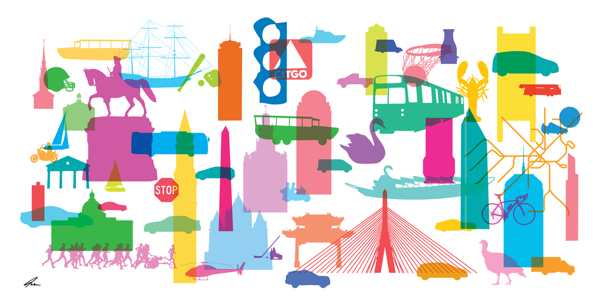 a Boston ambulance, a Boston police car, a Boston fire truck, USPS, truck, A Boston tram, a turkey, MBTA map, a cyclist, Dorchester's Pear sculpture, Duck Tours bus and boat, swan boat, lobster, cars (of different type), bikes, boats, Tea Party ship, George Wahsington statue, baseball, football, soccer, basketball, hockey, bus, marathon runners ,stop sign, Citygo sign, traffic light, helicopter.