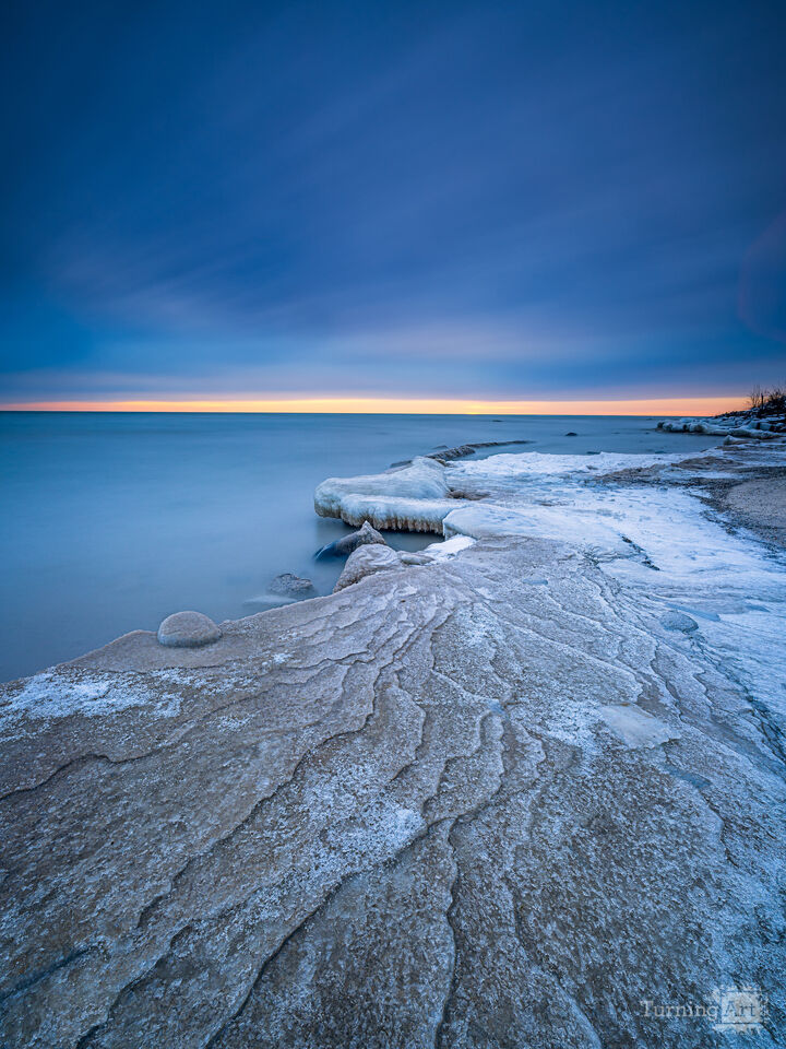 A serene view of an icy Lake Michigan shoreline meeting a calm, expansive body of water under a vast, blue sky. The horizon glows subtly with the first light of dawn.