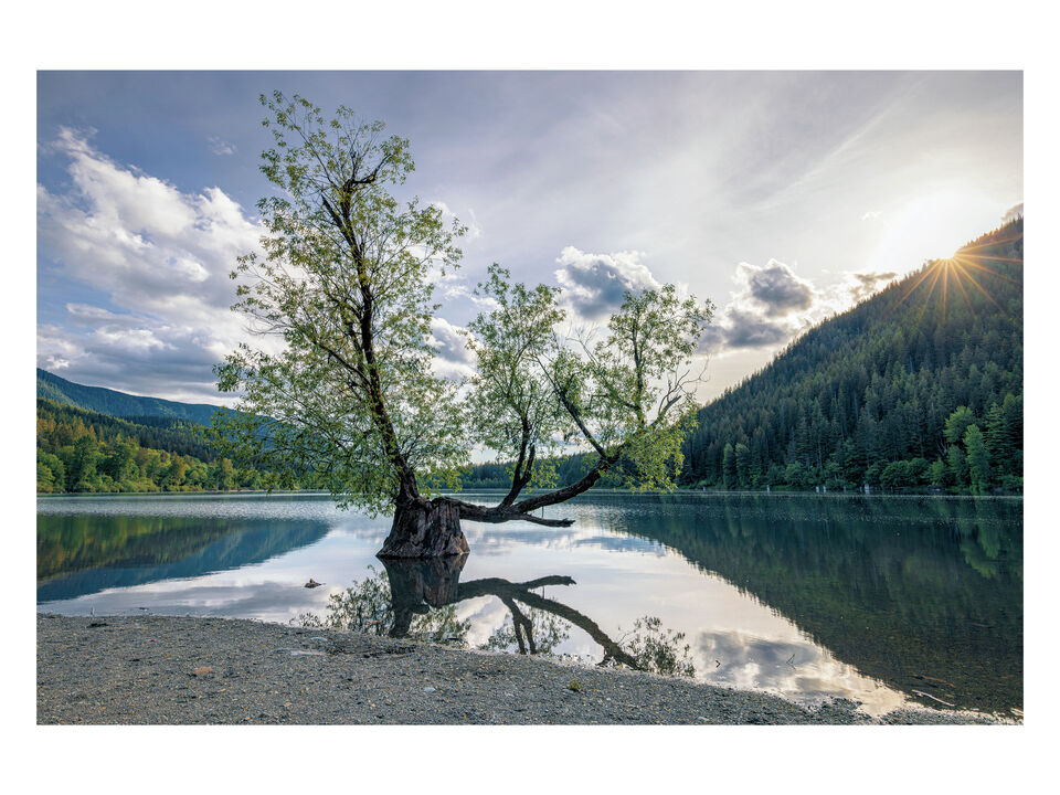 To make the best of my final days living in Snoqualmie, Washington. I have made it my mission to make as much art as possible from its awe-inspiring landscape. One of my favorite places within 15 minutes is Rattlesnake Lake. And, in this image of this magical lake, I again make the tree I called Dendron Solus a focal point. I composed the image in such a way as to encourage your eyes to move throughout the scene.